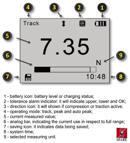 L'ampio display disponibile sul dinamometro EFG, offre numerose informazioni, sia in relazione allo stato dello strumento (es.